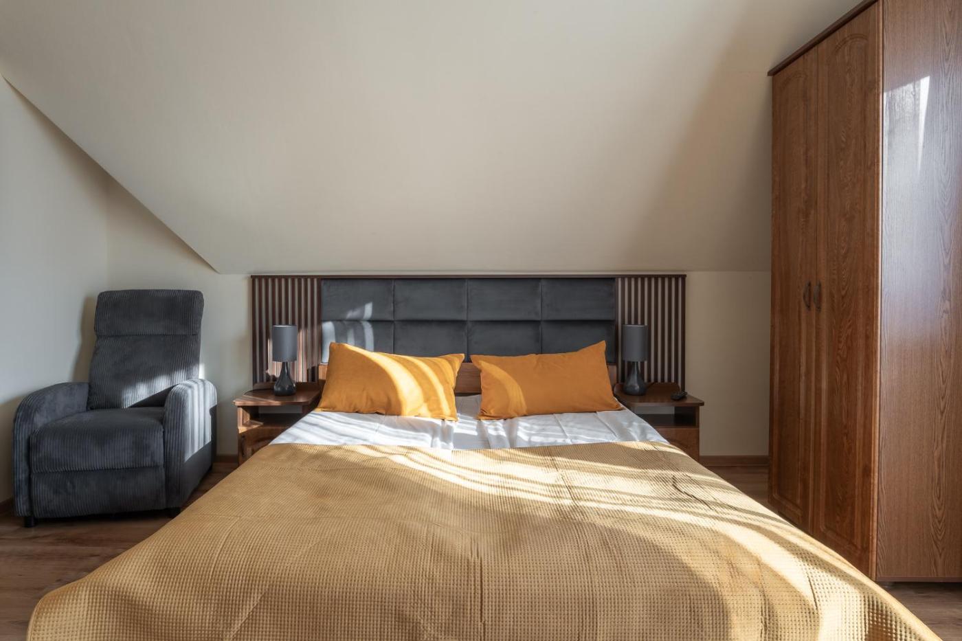 Pokój trzyosobowy z łazienką. Ten pokój trzyosobowy oferuje szafę, czajnik elektryczny oraz prywatną łazienkę z prysznicem. W tej opcji zakwaterowania dostępne są 2 łóżka. Pokój Trzyosobowy - 5 osobowy. Powierzchnia pokoju ok.: 15 mkw. ;